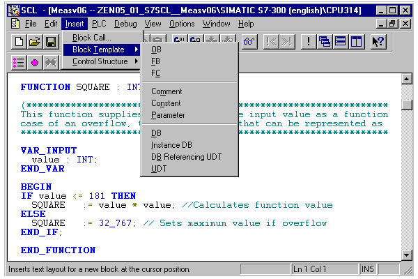 S7-SCL 程序可以被编程为 ASCII 源文件。因此可以与其它 ASCII 源文件和目标文件交换数据。S7-SCL 编辑器可以提供丰富的模板,模板只需填写并插入即可使用: