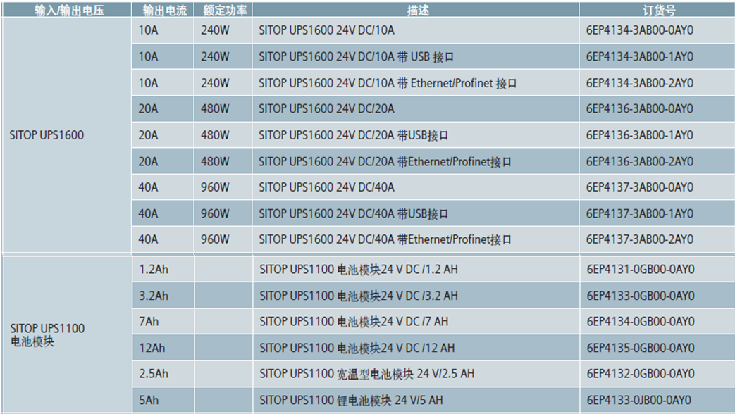 •24V 和高达 40 A 的 SITOP UPS1600 DC UPS 模块以及高达 12Ah 的 UPS1100 电池模块(总计72 Ah)