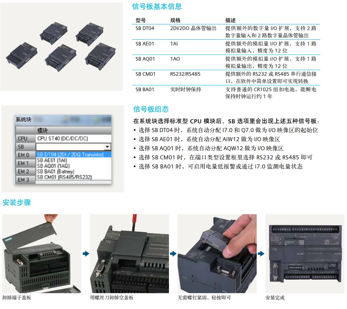 信号板直接安装在 SR/ST CPU 本体正面,无需占用电控柜空间,安装、拆卸方便快捷。对于 少量 I/O 点数扩展及更多通信端口需求,全新设计的信号板能提供更经济、灵活的解决方案。